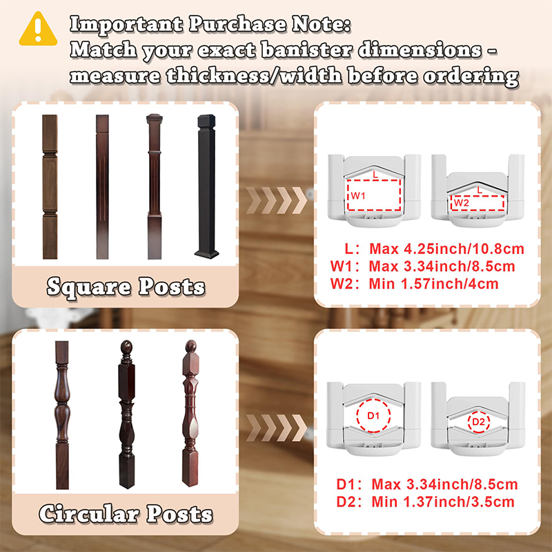 Kit de montaje para barandilla redonda/cuadrada: Compatible con postes redondos de 3,5 a 10 cm de diámetro y postes cuadrados de 4 a 10 cm de ancho. Ideal para puertas retráctiles para bebés, puertas de malla, puertas de hierro y más.