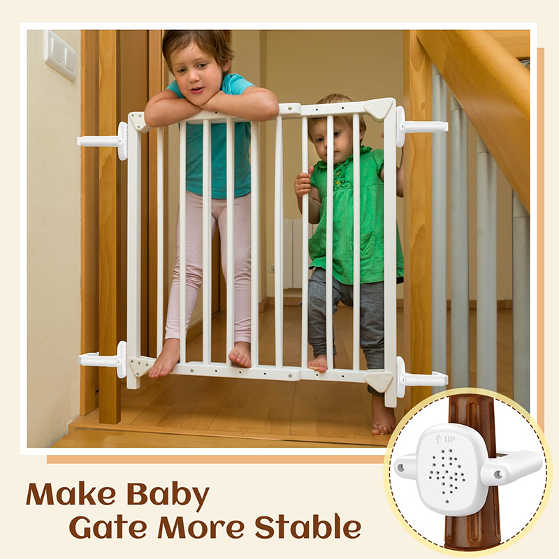 Auto Cerrar Sin taladrar Doble Bloqueo de madera Puerta de bebées adecuado para usar el ancho de la puerta de 74-99cm. Sin tornillo, sin perforación y fácil de instalar, pero no es fácil para un bebé para abrir la puerta con doble seguridad Bloqueo. El metal de hierro de alta calidad y la madera maciza duradera proporciona un hogar más seguro