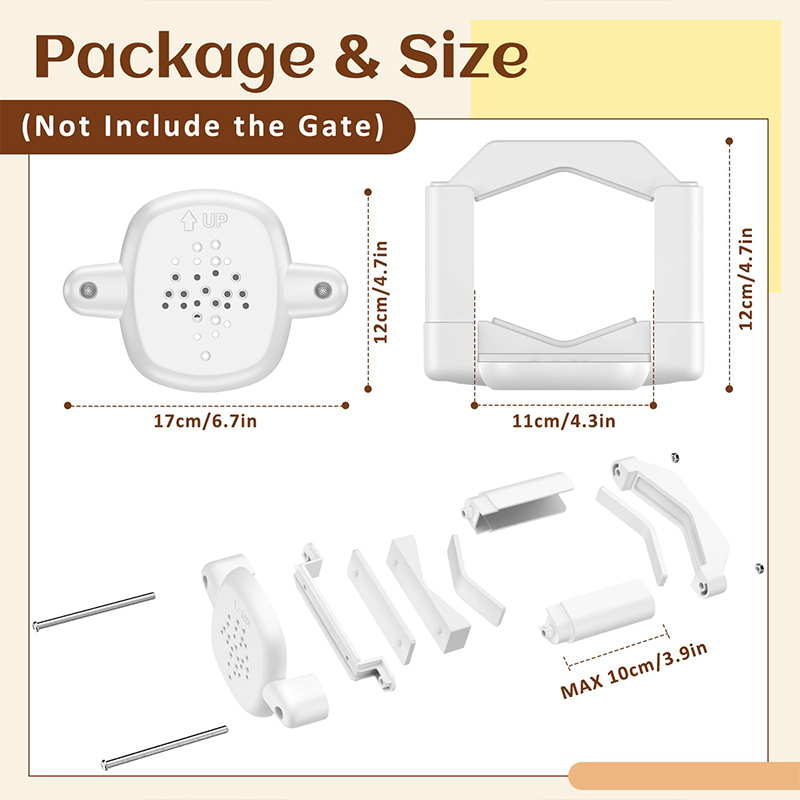 Uso versátil: perfecto para usar en la parte superior o inferior de las escaleras o en cualquier ubicación con superficies de montaje difíciles; se adapta a la mayoría de las puertas para bebés y mascotas líderes.