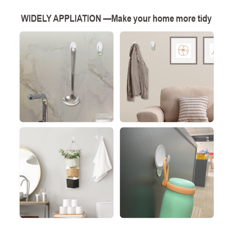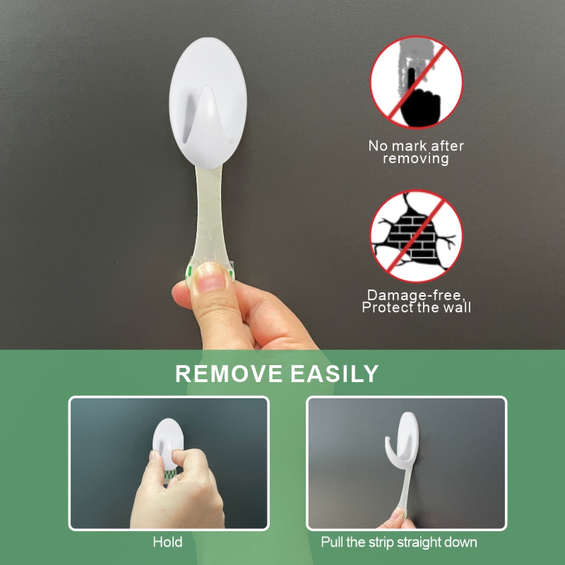 Los ganchos cuentan con un cuerpo de plástico blanco elegante y duradero combinado con una almohadilla adhesiva removible de alto rendimiento. Sujeta de forma segura artículos diarios livianos (toallas, accesorios, etc.) en superficies lisas (azulejos, vidrio, madera) sin perforar; el adhesivo se despega limpiamente, sin dejar residuos.