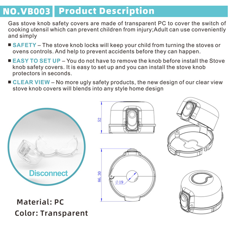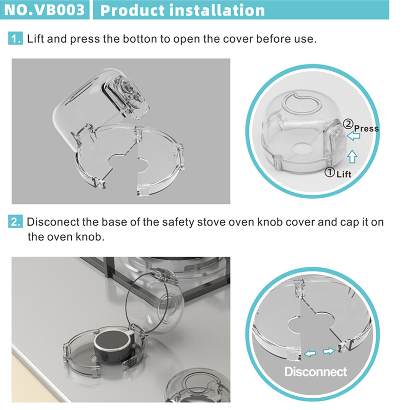 Product Name: Safety Stove Oven Knob Cover VB003 Product OverviewOur Safety Stove Oven Knob Cover is designed to protect your family from accidental stove activation by curious children. Made of high-quality transparent PC material, it provides a clear view of your stove while preventing unauthorized operation, keeping your kitchen safe without compromising on style.