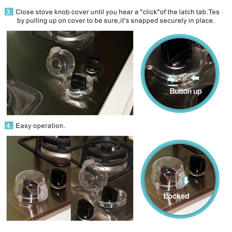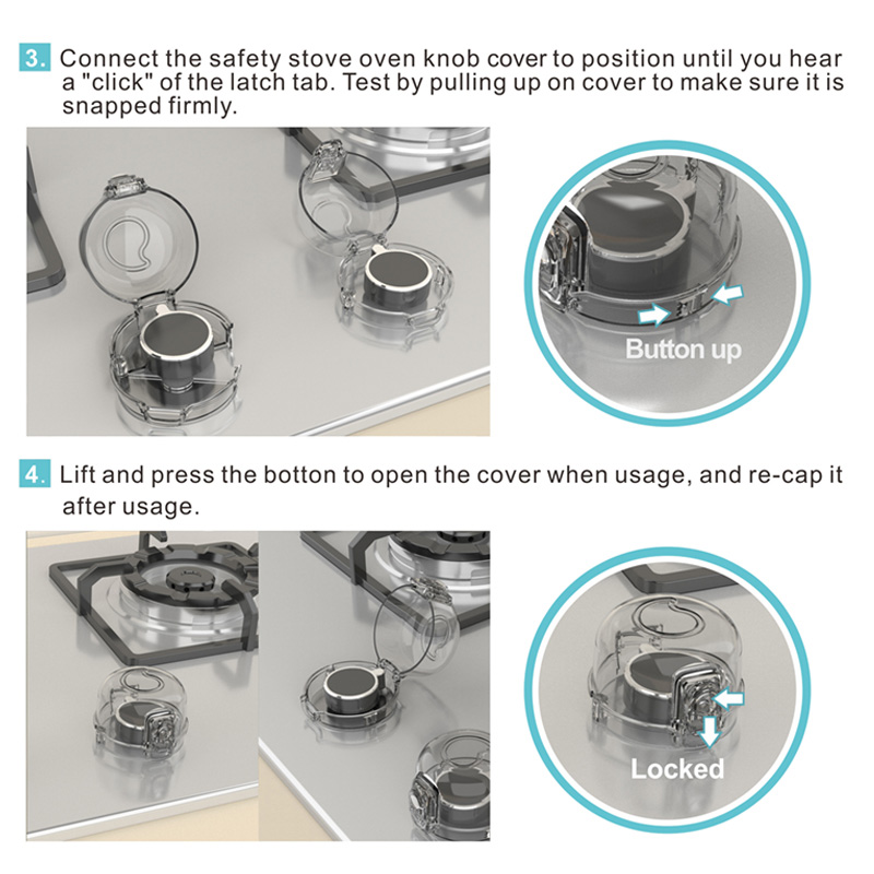 Key Features & Advantages 1.Child Safety Protection Effectively prevents children from turning on gas stoves or ovens, eliminating the risk of gas leaks, burns, and kitchen fires caused by accidental touches. 2.High-Temperature Resistant PC Material Made of durable, food-safe PC plastic, it withstands high kitchen temperatures without deformation or releasing harmful substances, ensuring long-term use. 3. Tool-Free, Easy Installation No need to remove your existing stove knobs! Simply disassemble the base, place it around the knob, and snap it shut – installation takes only seconds, perfect for any family. 4. Clear, Minimalist Design The transparent cover blends seamlessly with any kitchen style, keeping your stove looking neat and modern without the bulk of traditional safety products. 5. Easy Daily Operation The push-to-open design allows adults to easily access the knob when cooking, while remaining child-resistant. Simply lift and press the button to open, then close and lock it after use. 6. Universal Fit Fits most standard stove/oven knobs with a base diameter up to 58mm and a shaft diameter of 19mm, suitable for most gas stoves, ovens, and range hoods on the market.