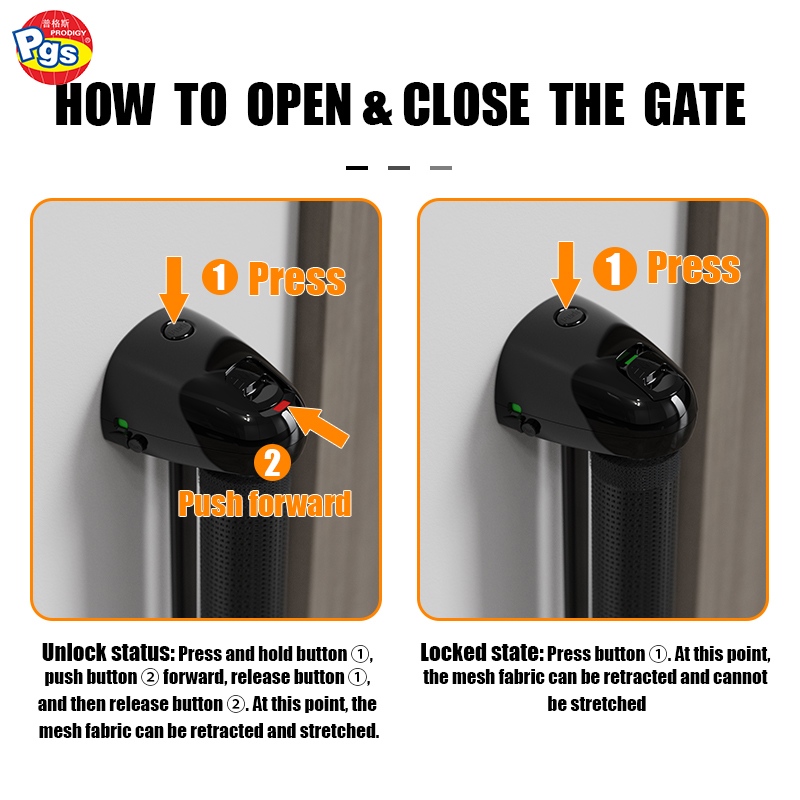 1.One-Hand Operation & Easy to UseWith a simple press-and-push mechanism, you can open/close the gate with just one hand. No need to hold the button while pulling the mesh; simply unlock and pull, then the mesh retracts automatically for quick, hassle-free access. The adjustable lower bracket ensures a secure fit for different installation scenarios.
