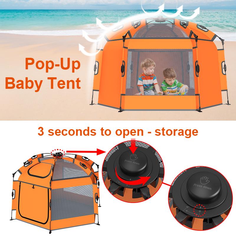- Diseño profesional: Las paredes laterales de malla permiten el paso de la brisa y permiten que mamá tenga una vista completa de lo que ocurre en el interior. La puerta mosquitera se puede cerrar por completo para evitar la entrada de mosquitos y arena.